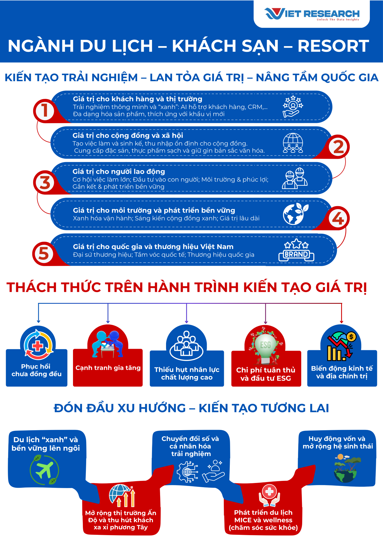 After the pandemic, the global and Vietnamese tourism landscape entered a period of strong reshaping. Changing tastes and expectations of tourists, along with socio-economic fluctuations and new technologies, are outlining key trends for the coming period. Businesses that grasp and stay one step ahead will not only create a competitive advantage, but also open up opportunities for breakthroughs and create new values for the industry. There are 05 main trend groups from the survey of businesses in the Top 10 Value-Creating Enterprises in Vietnam 2025 - Tourism - Hotel - Resort Industry by Viet Research.