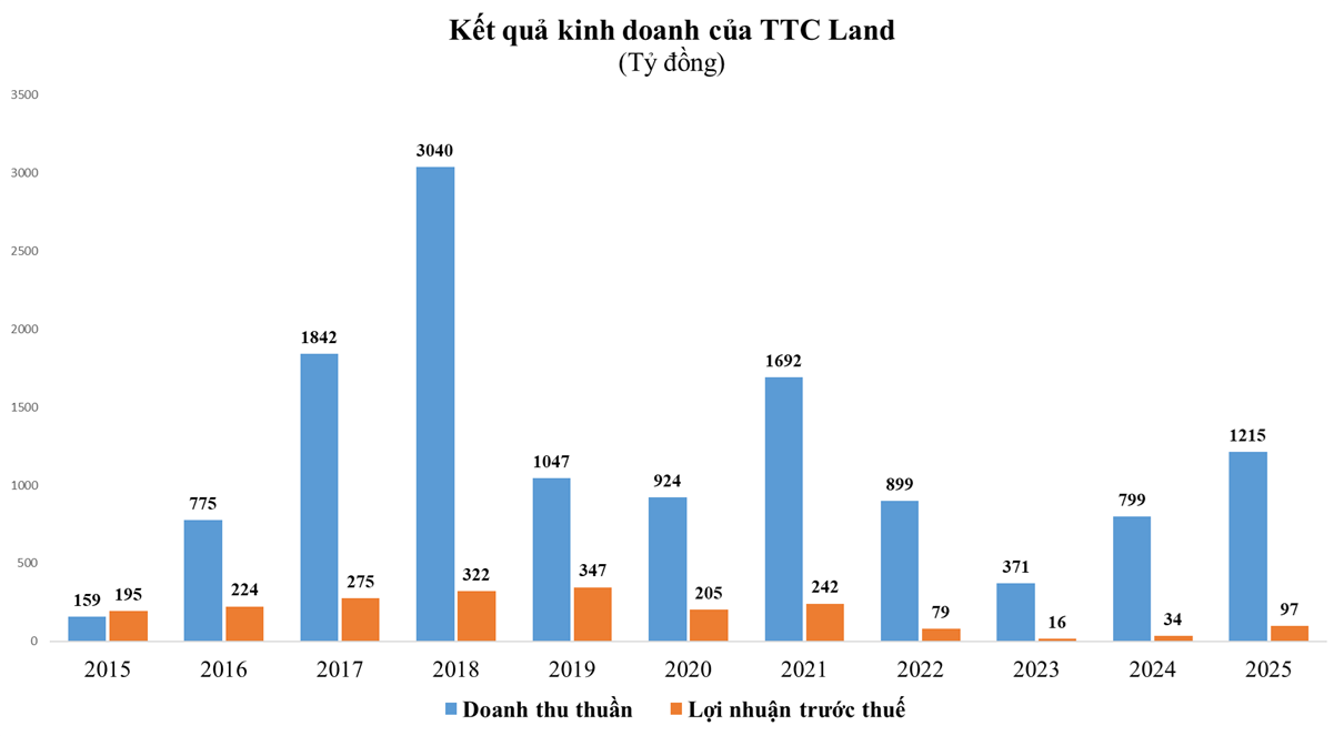 Năm 2025, TTC Land đạt doanh thu 1.215 tỷ đồng, tăng 52% so với năm 2024 và lợi nhuận sau thuế gần 67,4 tỷ đồng, gấp gần 15 lần cùng kỳ.