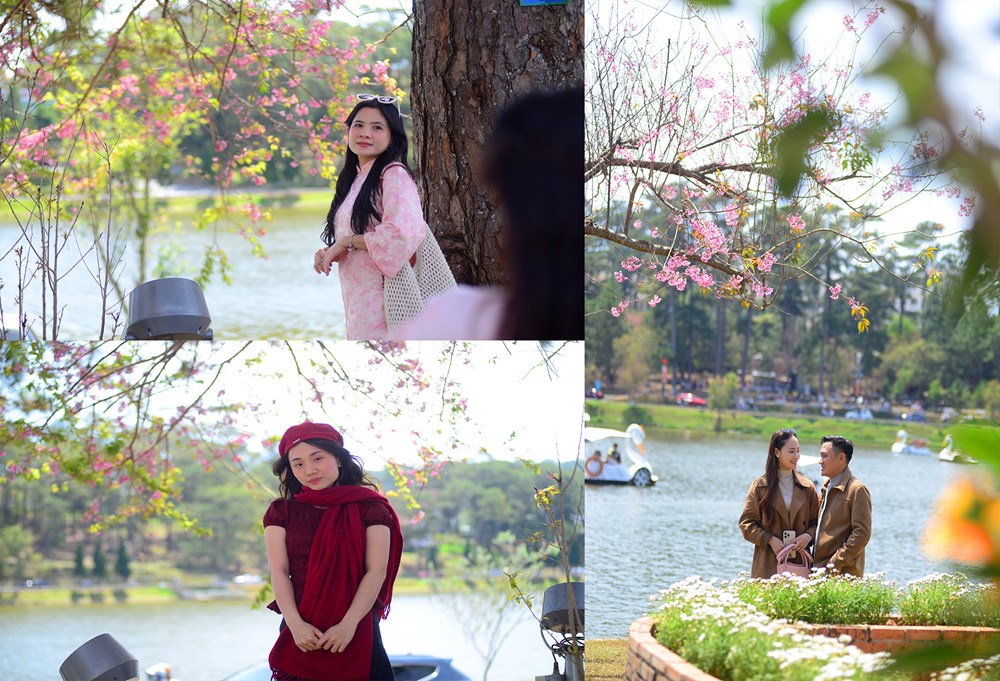 Nhiều du khách tranh thủ check in với hoa mai anh đào cuối mùa bên hồ Xuân Hương