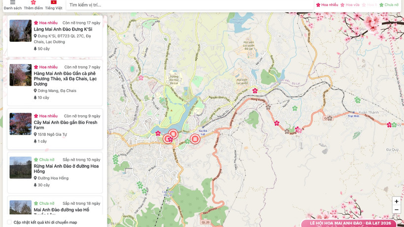 Với bản đồ mai anh đào Đà Lạt số, du khách có thể tra cứu thông tin chính xác về từng địa điểm, trạng thái của từng khu vực hoa nở.