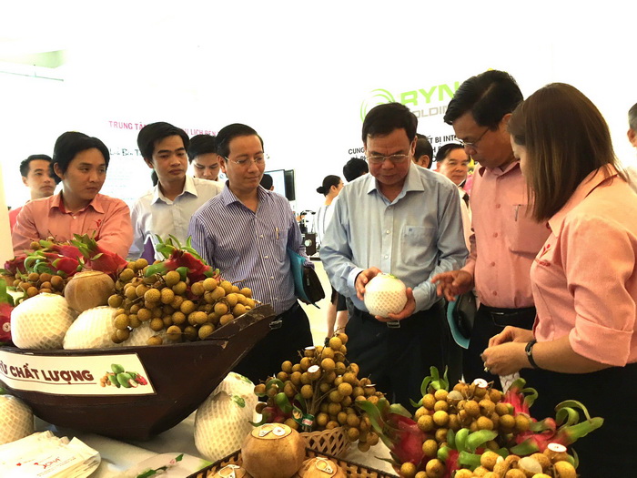 Bí thư Tỉnh ủy Bến Tre Võ Thành Hạo cùng các đại biểu tham quan các sản phẩm nông nghiệp được giới thiệu tại Diễn đàn