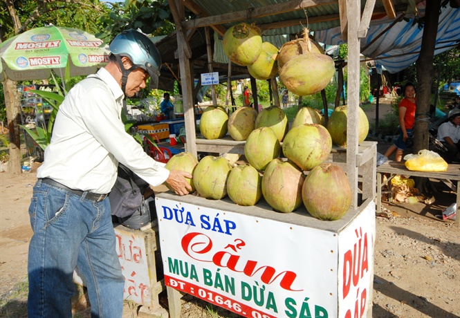 Tại huyện Cầu Kè (Trà Vinh) dừa sáp (có một lớp cơm dày trong ruột xốp, thịt dẻo, vị béo, thơm ngon) là loại đ...