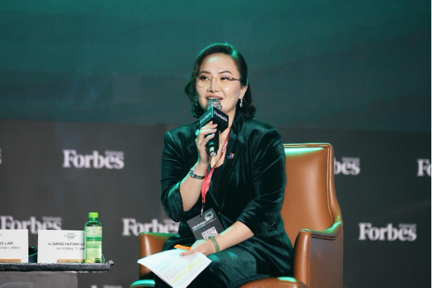 Chị Ức My khẳng định lợi thế cạnh tranh bền vững với chiến lược kinh doanh ‘xanh’ làm cốt lõi của doanh nghiệp tại Hội nghị Phát triển bền vững ngày 13/4/2023 do Forbes Việt Nam tổ chức